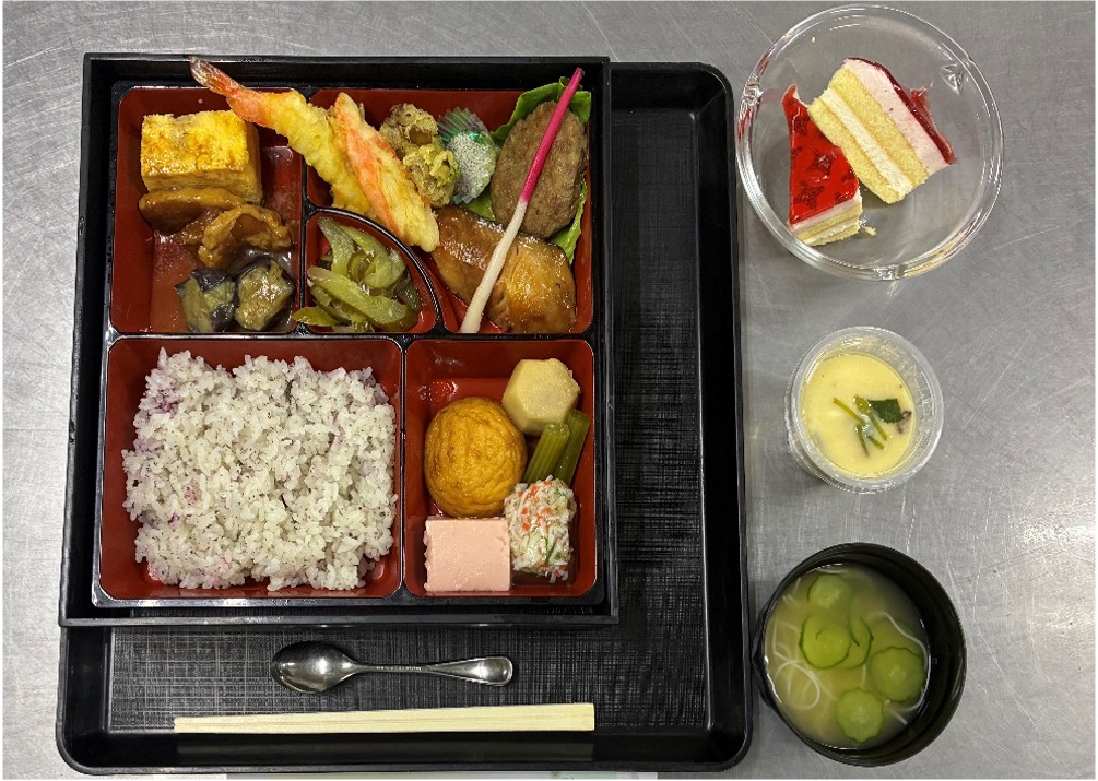 投稿日: 2025年11月17日2025年11月18日 投稿者: 管理者旭川市にある施設 特別養護老人ホーム、短期入所、障碍者支援施設、短期入所、デイサービスがある旭川の施設です。 月に1回、行事食を提供しています。 8月の行事食 【納涼御膳】 ・ゆかりごはん ・ハンバーグ ・焼魚(銀鱈) ・天ぷら ・炊き合わせ ・煮凝り ・茄子田楽 ・盛り合わせ ・胡瓜とみょうがの酢の物 ・ごま豆腐 ・茶碗蒸し ・冷や汁 ・ケーキ ミキサー食 きざみ食